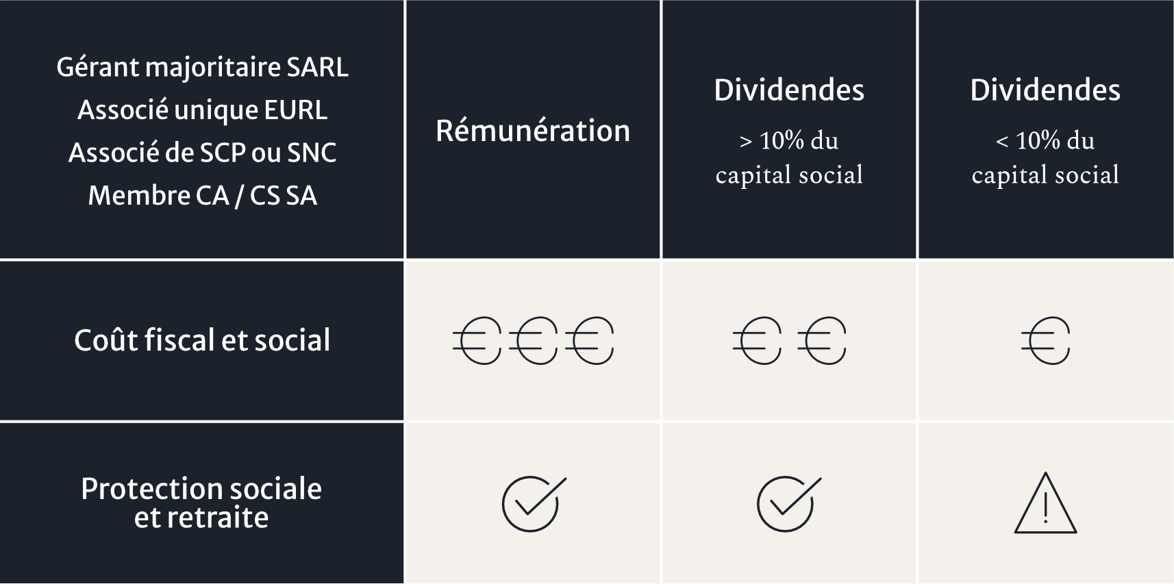 c’est-à-dire réduire le poids des charges et des impôts pour la structure afin de maximiser le résultat net tout en augmentant la rémunération du dirigeant sans toutefois négliger ni sa protection sociale ni sa retraite.